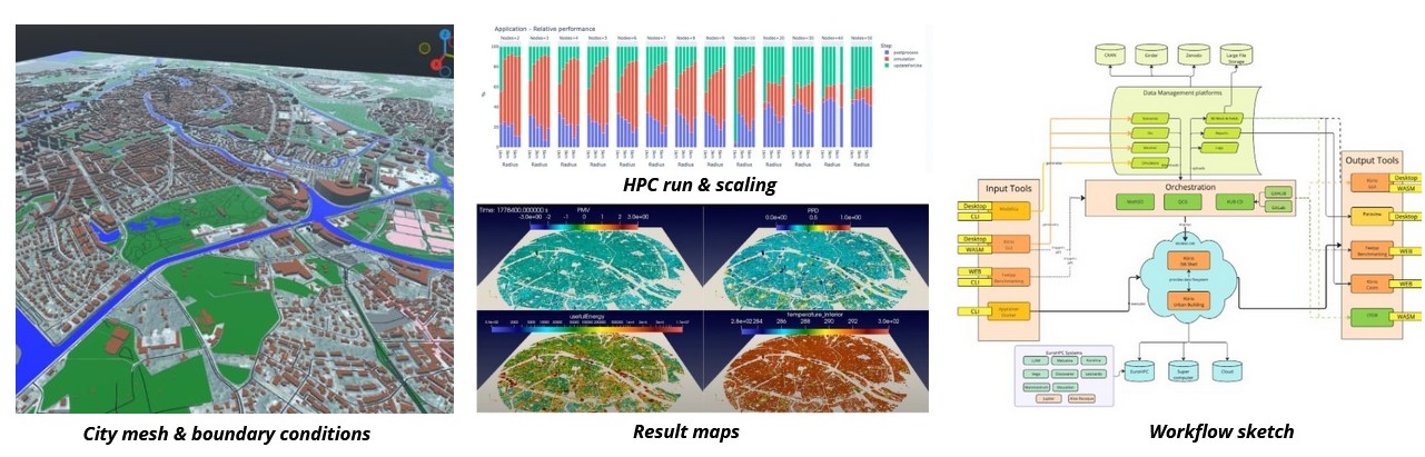 Urban planners and utilities are increasingly relying on digital twins to quantify energy use, microclimate, and resilience. I’ll present our end-to-end pipeline, which includes data ingestion (GIS), meshing and model setup, large-scale energy simulation on HPC, and automated reporting, for district-to-metro scale scenarios. We’ll share use cases from the HiDALGO2 CoE (addressing global challenges) and the Exa-MA/NumPEx program (developing methods & algorithms for exascale), demonstrating how open tools and reproducible CI/CD enable the transformation of complex numerics into actionable insights for the built environment.